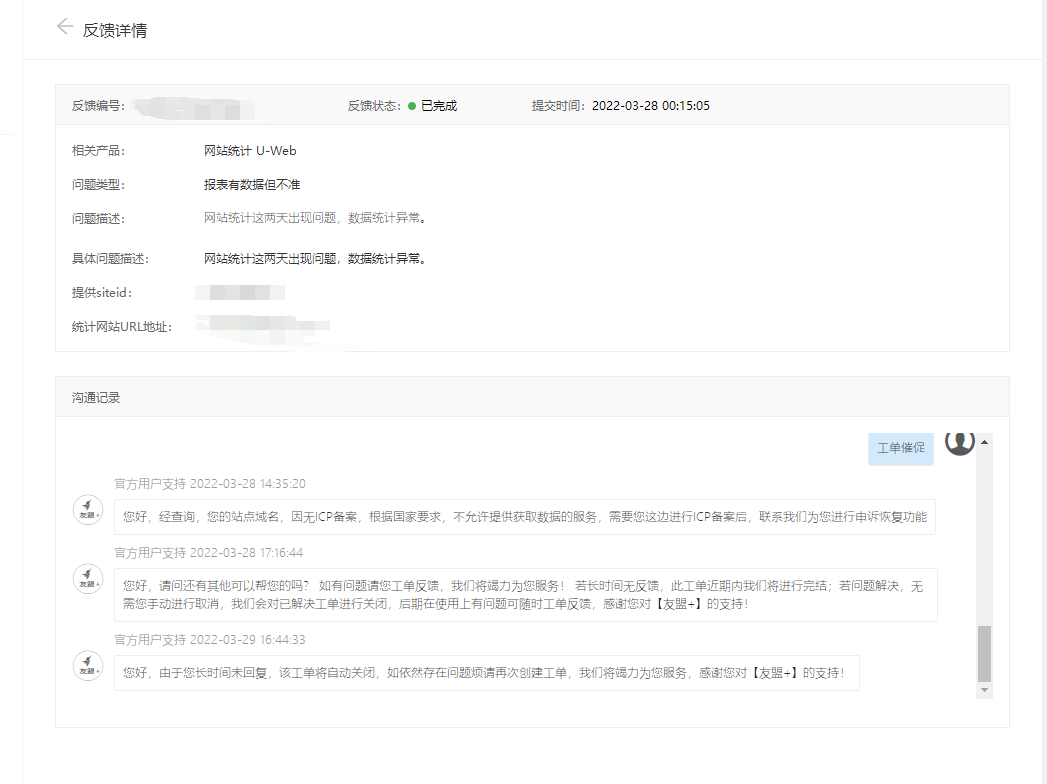 由于前段时间我不经意的想看看本站的流量状况,于是就登录了cnzz(也就是友盟)查看数据,刚进去就发现数据出行了异常,于是自己排查了下是否是自己设置的问题,经过检查没发现问题,于是很纳闷就提交了工单,刚开始客服也没说出个一二,就让我提供了账号密码。后面经过一个小时左右吧,工单有最新的回复,于是我就看了下客服的回复,客服提示:您好,经查询,您的站点域名,因无ICP备案,根据国家要求,不允许提供获取数据的服务,需要您这边进行ICP备案后,联系我们为您进行申诉恢复功能。